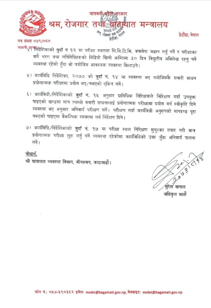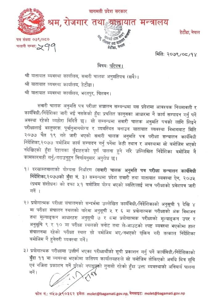 बागमती प्रदेशको श्रम, रोजगार तथ यातायात मन्त्रालयले ७० अंक प्राप्त गर्नेलाई ड्राइभिङ लाइसेन्सको प्रयोगात्मक परीक्षमा पास हुने व्यवस्था मिलाउन यातायात व्यवस्था कार्यालय, सवारी चालक अनुमतिप (सबै), यातायात व्यवस्था कार्यालय, हेटौंडा, यातायात व्यवस्था कार्यालय भरतपुर, चितवनको नाममा मंसिर १४ गते परिपत्र जारी गरेको हो।