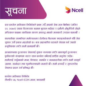 एनसेलले सूचनामार्फत सडक बिस्तारको क्रममा सेवा अवरुद्ध भएको भन्दै यसले सेवामा पर्न गएको असुविधाका लागि क्षमा मागेको छ।