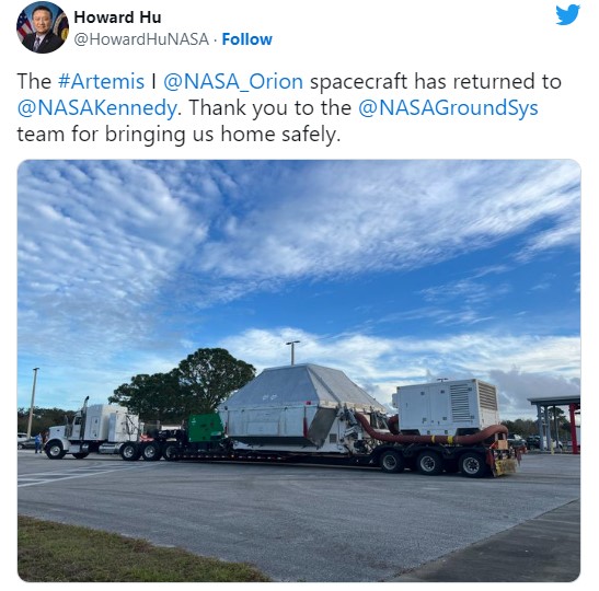 नासाको आर्टेमिस वान ओरियन नामक अन्तरिक्ष यानले १.४ मिलियन माइलको यात्रा सफलतापूर्वक तय गरी केनेडी स्पेस सेन्टरमा आइपुगेको छ। उक्त अन्तरिक्ष यानको ‘होम कमिङ्ग’ गत डिसेम्बर ३१ मा सम्पन्न भएको इनग्याजेडले उल्लेख गरेको छ।