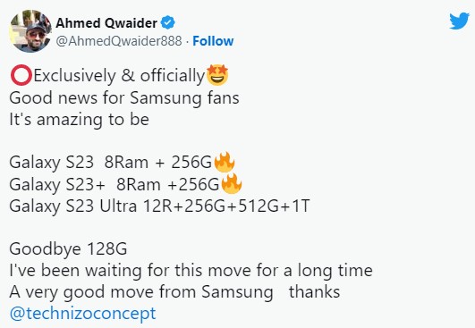 सामसङले कम्तिमा २५६ जीबी स्टोरेज सहित ग्यालेक्सी एस २३ स्मार्टफोनहरु सार्वजनिक गर्ने भएको छ। १२८ जीबीको अप्सन अब नरहेको हुनाले ग्यालेक्सी एस २३ अल्ट्राको ८ जीबी र्याम भर्जनको सट्टा १२ जीबी हुने अहमद क्वाइदरले ट्विटरमा पोष्ट गरेका छन्।