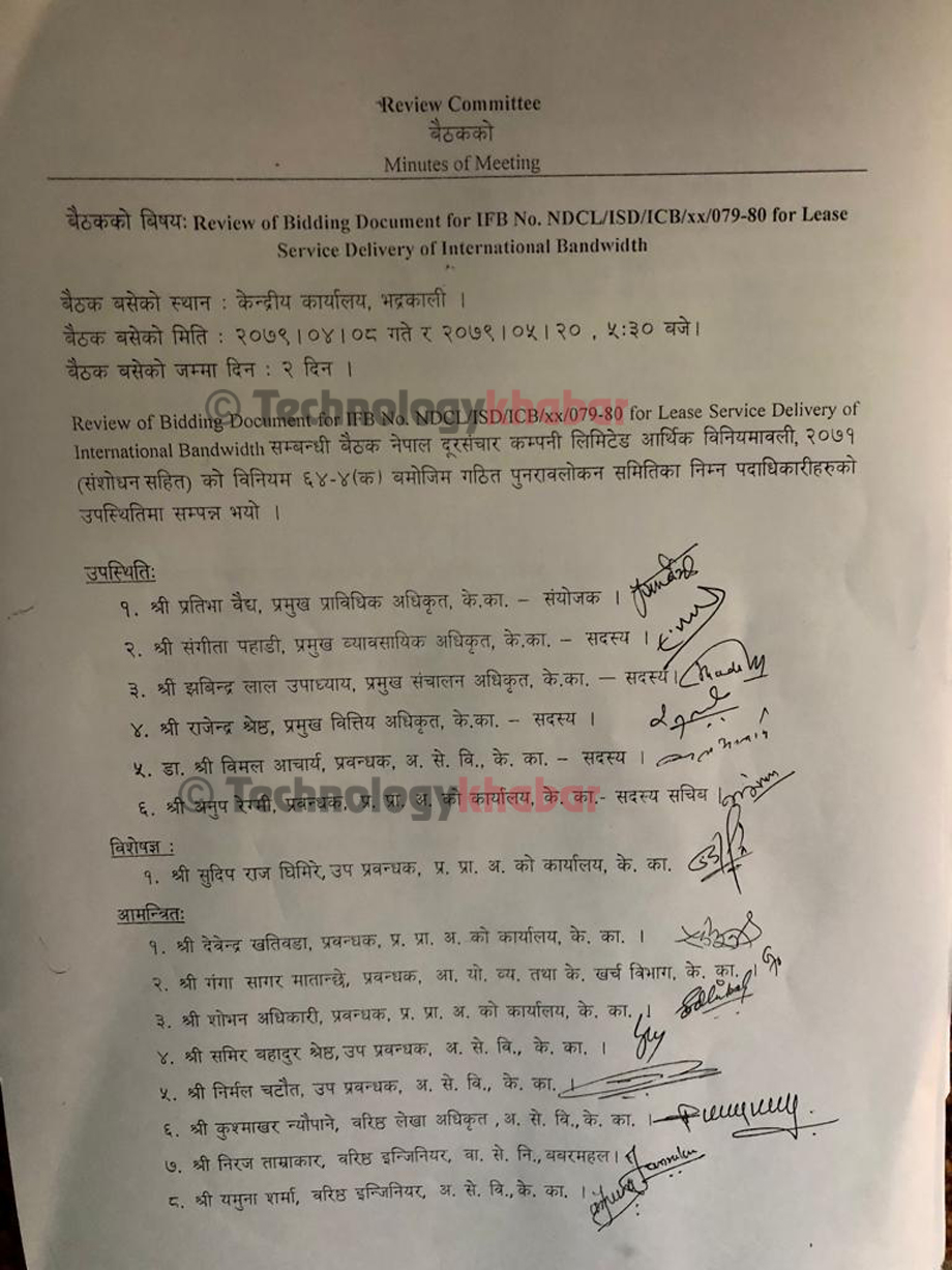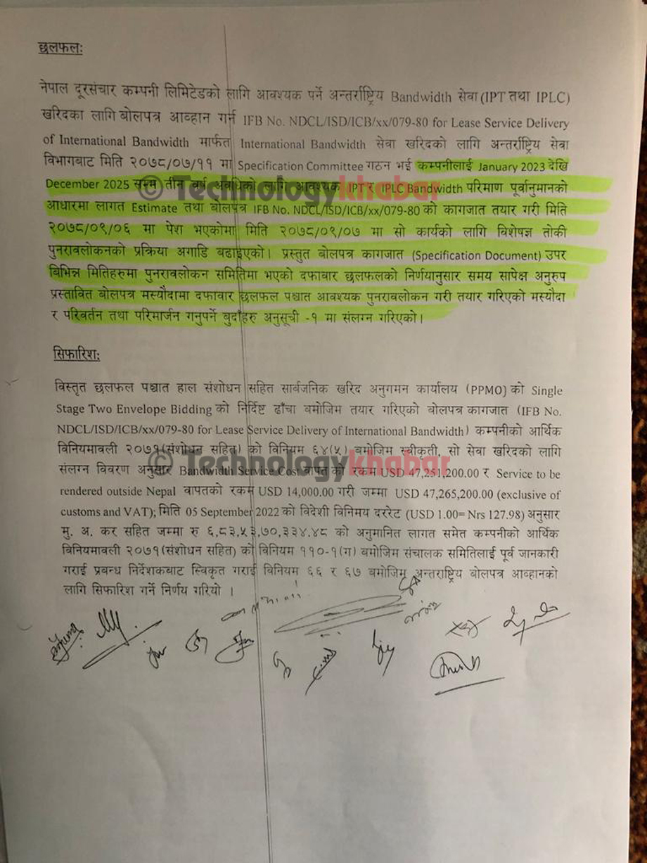 यसैबीच, हालै सम्झौता समाप्त भएको Contract no NDCL/ISD/ICB/01/76-77 मा १ वर्ष प्लस १ वर्ष थप गर्ने प्रावधान भएतापनि २०७९ जेठ २३ मा बसेको रिभ्यू कमिटीले माथि उल्लेखित प्रावधानअनुसार नगरी नयाँ बोलपत्र आब्हान गर्नको लागि (IFB No.NDCL/ISD/ICB/xx/079-80 for Lease Service Delivery of International Bandwidth) सम्पूर्ण ब्याण्डविथसमेत बोलपत्र मार्फत खरिद गर्न भनि २०७९ जेठ २३ गते निर्णय गरेको थियो। तर अहिले उक्त निर्णय लत्याएर नयाँ बोलपत्र आब्हान नै नगरी सिधै सझौता गरिसकिएको छ।