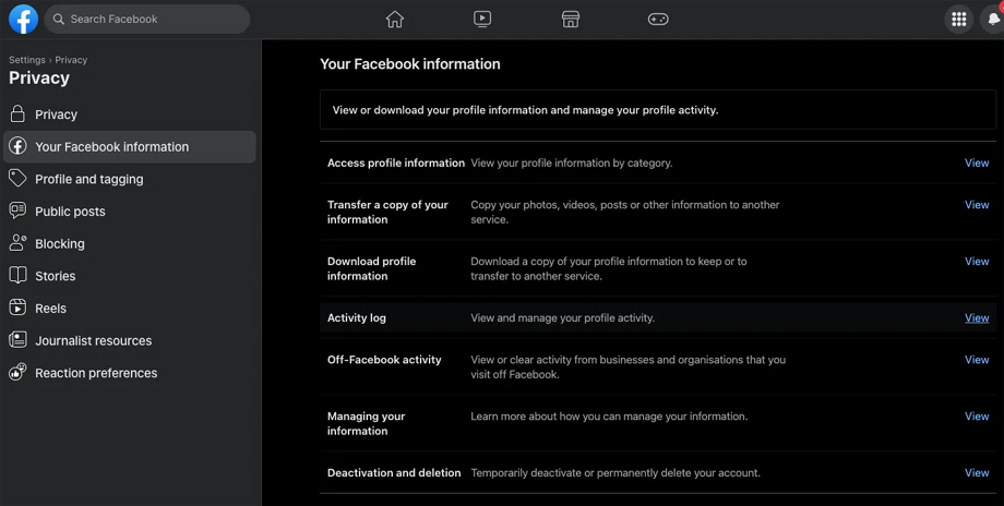 स्टेप ३: अब तपाईंले प्राइभेसीमा क्लिक गर्नुपर्नेछ र यहाँ तपाईंले फेसबुक इन्फर्मेशन विकल्पमा क्लिक गर्नुपर्नेछ।