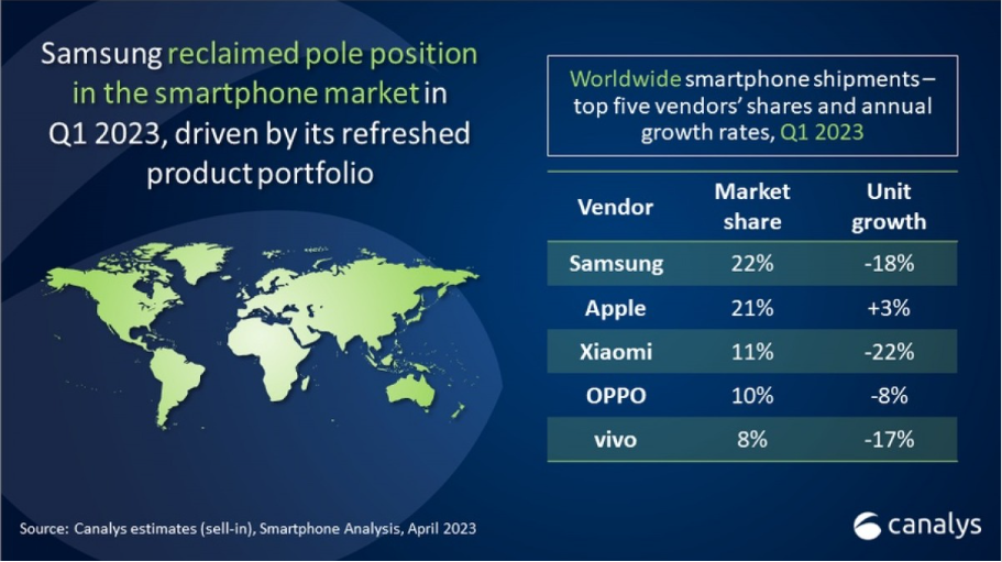 सामसङले पहिलो त्रैमासिकमा ६०.३ मिलियन स्मार्टफोन ढुवानी गरेकार २२ प्रतिशत मार्केट सेयर ओगटेको छ। सामसङ परिमार्जन गरिएको ग्यालेक्सी एस र ग्यालेक्सी ए पोर्टफोलियाबाट बाउन्स ब्याकको नेतृत्व गरेको छ।