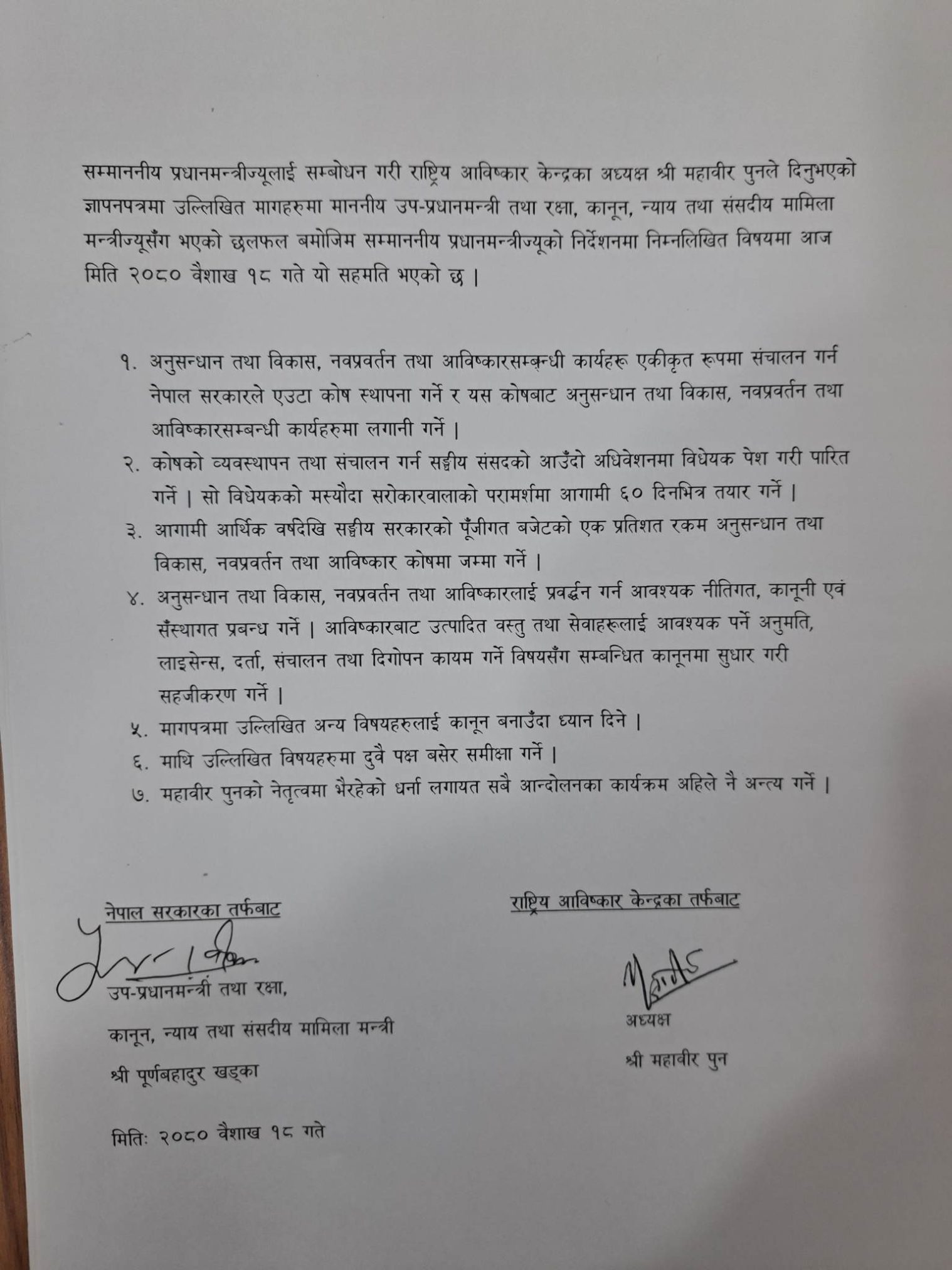 प्रधानमन्त्रीज्यूलाई सम्बोधन गरी राष्ट्रिय आविष्कार केन्द्रका अध्यक्ष श्री महावीर पुनले दिनुभएको ज्ञापनपत्रमा उल्लिखित मागहरूमा माननीय उप–प्रधानमन्त्री तथा रक्षा, कानून, न्याय तथा संसदीय मामिला मन्त्रीज्यूसँग भएको छलफल बमोजिम सम्माननीय प्रधानमन्त्रीज्यूको निर्देशनमा निम्नलिखित विषयमा आज मिति २०८० वैशाख १८ गते यो सहमति भएको छ ।
