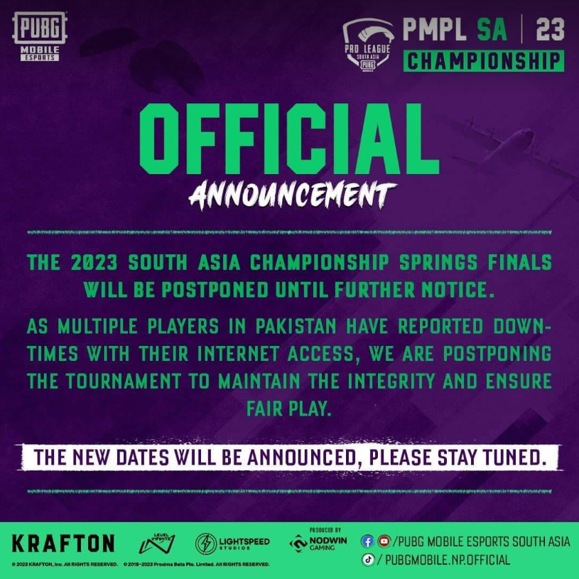 पब्जी मोबाइल प्रो लिग (पीएमपीएल) साउथ एशिया च्याम्पियनसिप स्प्रिङ २०२३ को फाइनल स्थगित भएको छ। पाकिस्तानका पब्जी खेलाडीहरुले इन्टरनेटमा समस्या भोगकाले प्रतियोगिता स्थगित गरिएको पब्जी मोबाइल इस्पोर्ट्सले आधिकारिक घोषणा मार्फत जानकारी दिएको छ।