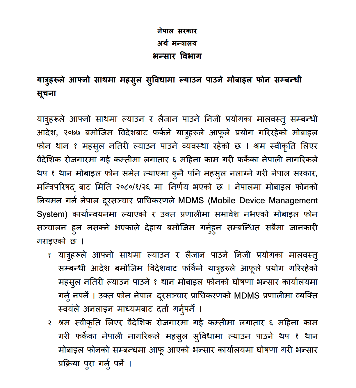 जसअनुसार श्रम स्वीकृति लिएर वैदेशिक रोजगारमा गई कम्तीमा लगातार ६ महिना काम गरी फर्केका नेपाली नागरिकले थप १ थान मोबाइल फोन समेत ल्याएमा कुनै पनि महसुल नलाग्ने गरी नेपाल सरकार, मन्त्रिपरिषद् बाट मिति २०८०/१/२६ मा निर्णय भएको जनाएको छ।