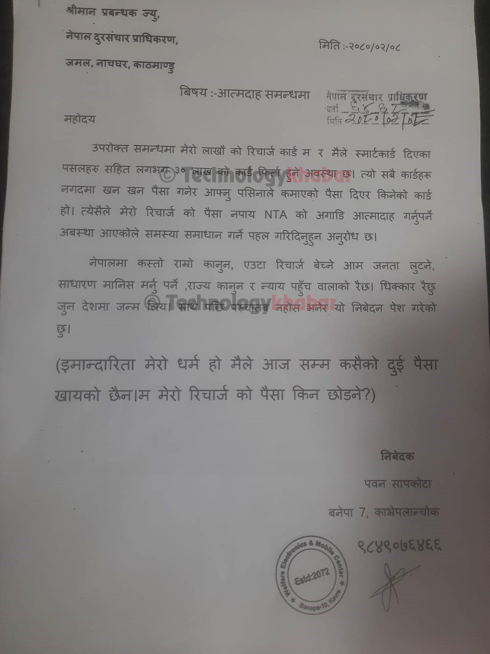 उनले ६४६८ दर्ता नम्बरमा दर्ता गरेको पत्रमा भनेका छन्, “त्यो सबै कार्डहरू नगदमा खन खन पैसा गनेर आफ्नु पसिनाले कमाएको पैसा दिएर किनेको कार्ड हो। त्यसैले मेरो रिचार्ज को पैसा नपाए एनटीएको अगाडि आत्मदाह गर्नुपर्ने अबस्था आएकोले समस्या समाधान गर्ने पहल गरिदिनुहुन अनुरोध छ।”