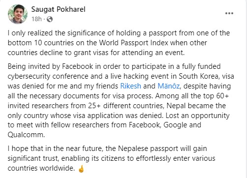 सम्मेलनमा सहभागी हुनका लागि आवश्यक सबै प्रक्रिया पुरा गर्दा नेपालको पासपोर्ट कमजोर भएकाले भिसा प्राप्त गर्न नसकिएको भन्दै इथिकल ह्याकर सौगात पोखरेलले फेसबुकमा पोस्ट गरेका छन्।