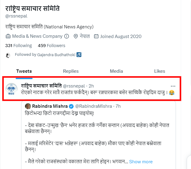उक्त ह्याण्डलले मिश्रको स्टयाटस रिट्वीट गर्दै लेखेको छ, “रोएको नाटक गरेर मात्रै राजतंत्र फर्कदैन्। बरू रत्नपार्कमा बसेर साँच्चिकै रोइदिम दाजु।”