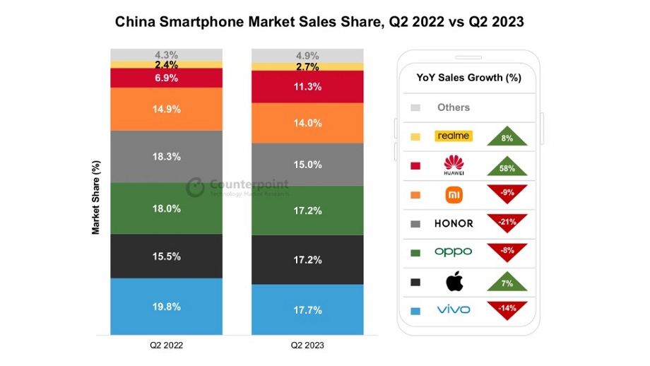 २०२३ को पहिलो ६ महिनामा सामना गरिएका चुनौतिहरूको बावजुद, काउन्टरपोइन्ट रिसर्चले चीनको स्मार्टफोन बजारमा वर्षभरिको बिक्रीमा थोरै मात्र गिरावट आउने अनुमान गरेको छ। पहिलो अर्ध वार्षिकको तुलनामा दोस्रो अर्ध वार्षिकमा सुधारहरू हुने अपेक्षा गरिएको छ भने निरन्तर बजार चुनौतीहरूको कारणले गर्दा महत्त्वपूर्ण रिबाउन्ड चुनौतीपूर्ण हुनसक्ने उल्लेख छ।