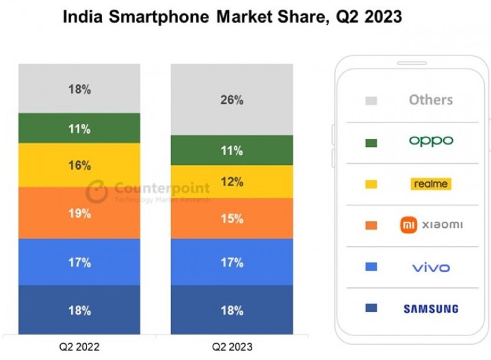 भिभो १७ प्रतिशत, शाओमी १५ प्रतिशत, रियलमी १२ प्रतिशत र ओप्पो ११ प्रतिशत बजार सेयरसहित क्रमश दोस्रोदेखि पाँचौ स्थानमा रहेका छन्। अन्य ब्राण्डको बजार हिस्सा २६ प्रतिशत छ।