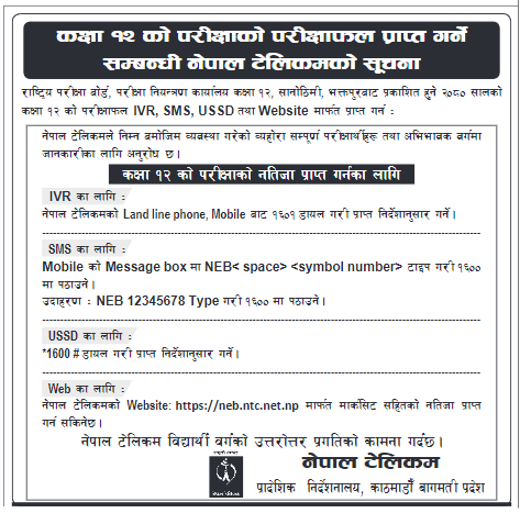 यसैबीच नेपाल टेलिकमले कक्षा १२ को परीक्षाफल आफ्ना विभिन्न सेवाहरुमार्फत हेर्न सकिने सूचना मार्फत जानकारी दिएको छ।