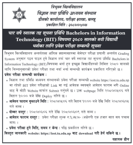 सूचना अनुसार, त्रिभूवन विश्वविद्यालयअन्तर्गतका आंगिक क्याम्पसहरुमा सेमेस्टर परीक्षा प्रणाली अन्तर्गत ग्रेडीङ सिस्टमअनुसार पठन पाठन हुने विज्ञान तर्फ चार वर्षे बीआइटी (Bachelors in Information Technology (BIT) का लागि प्रवेश परीक्षा तथा नयाँ भर्नाका लागि इच्छुक विद्यार्थीले आवेदन दिन सक्नेछन्।