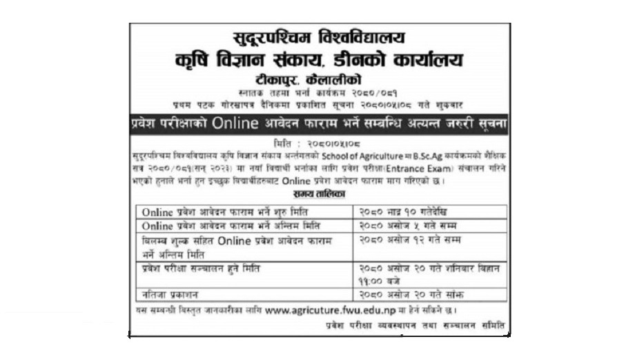 विस्तृत जानकारीका लागि www.agricuture.fwu.edu.np मा हेर्न सकिने र प्रवेश परीक्षाको आवेदन दिन सकिनेछ।