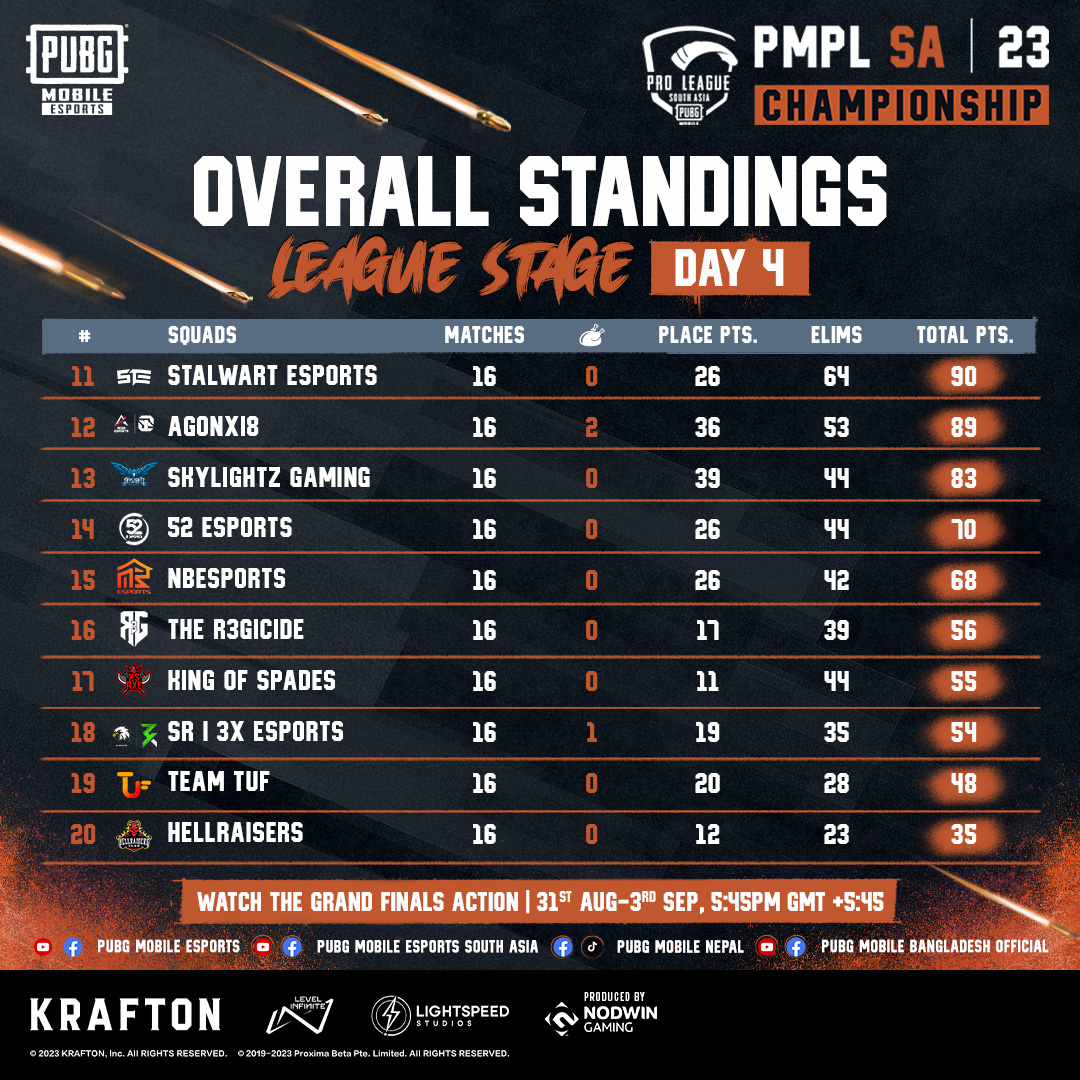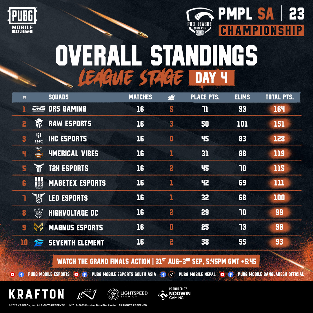 लिग चरणको दोस्रो स्थानमा पनि नेपाली टिम रअ इस्पोर्ट्स रहन सफल भएको छ। रअले १५१ प्वाइन्ट प्राप्त गर्दै दोस्रो भएको हो। रअले तीन चिकेन डिनर सहित ५० प्लेसमेन्ट र १०१ इलिमिनेसन प्वाइन्ट प्राप्त गरेको थियो।