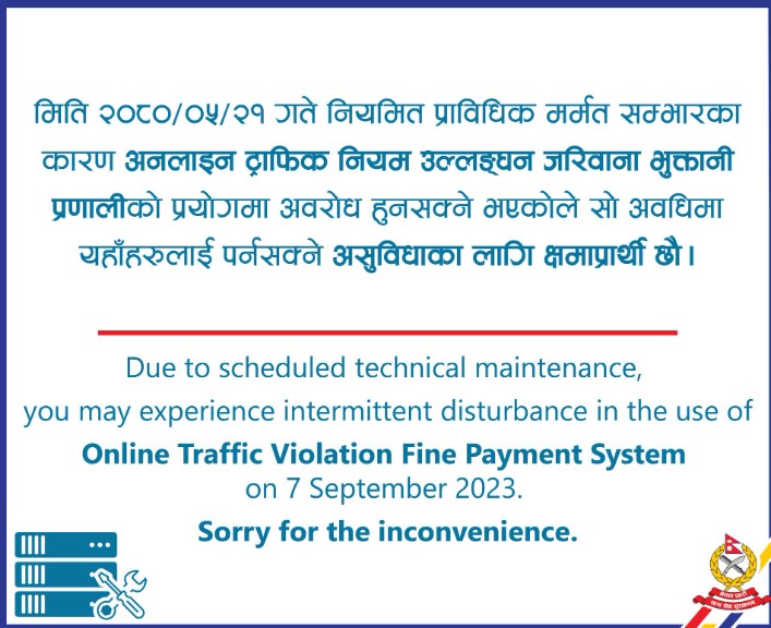 आज (बिहीबार) अनलाइन ट्राफिक जरिवान भुक्तानी प्रणालीको प्रयोगमा अवरोध हुने भएको छ।