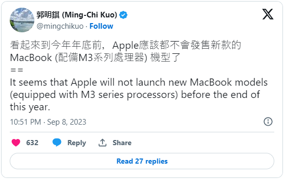 उद्योग विश्लेषक मिङ–ची कुओका अनुसार यथार्थ भने सायद त्यस्तो नहुन सक्छ। एप्पलले एम३ म्याकबुक मोडलहरू “यस वर्षको अन्त्य अघि’ जारी गर्ने योजना नबनाएको एक स्रोतलाई उदृत गर्दै बताएका छन्। एप्पल डेस्कटप प्रोडक्टहरूको भोल्युम कम्पनीको ल्यापटपहरू भन्दा धेरै कम भएकाले पर्याप्त चिपहरू प्राप्त गर्न सक्छन् भन्ने विचार प्रस्तुत गरिएको जीएसएमएरिनामा उल्लेख गरिएको छ।