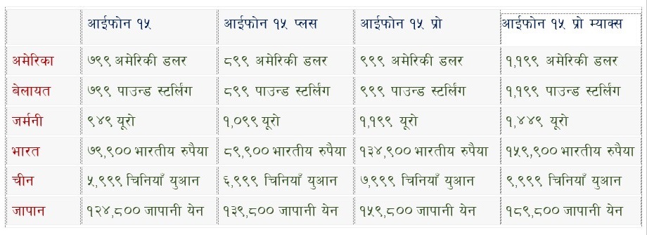एप्पलले अमेरिकामा १५, १५ प्लस र १५ प्रोको लागि बेस प्राइस (आधार मूल्यहरू) राखेको छ भने प्रो म्याक्समा १०० अमेरिकी डलर बढेको तर समान स्टोरेज अप्सन्स (भण्डारण विकल्पहरू) तुलना गर्दा मूल्य निर्धारण वास्तवमा परिवर्तन नभएको जिकिर गरेको छ।
