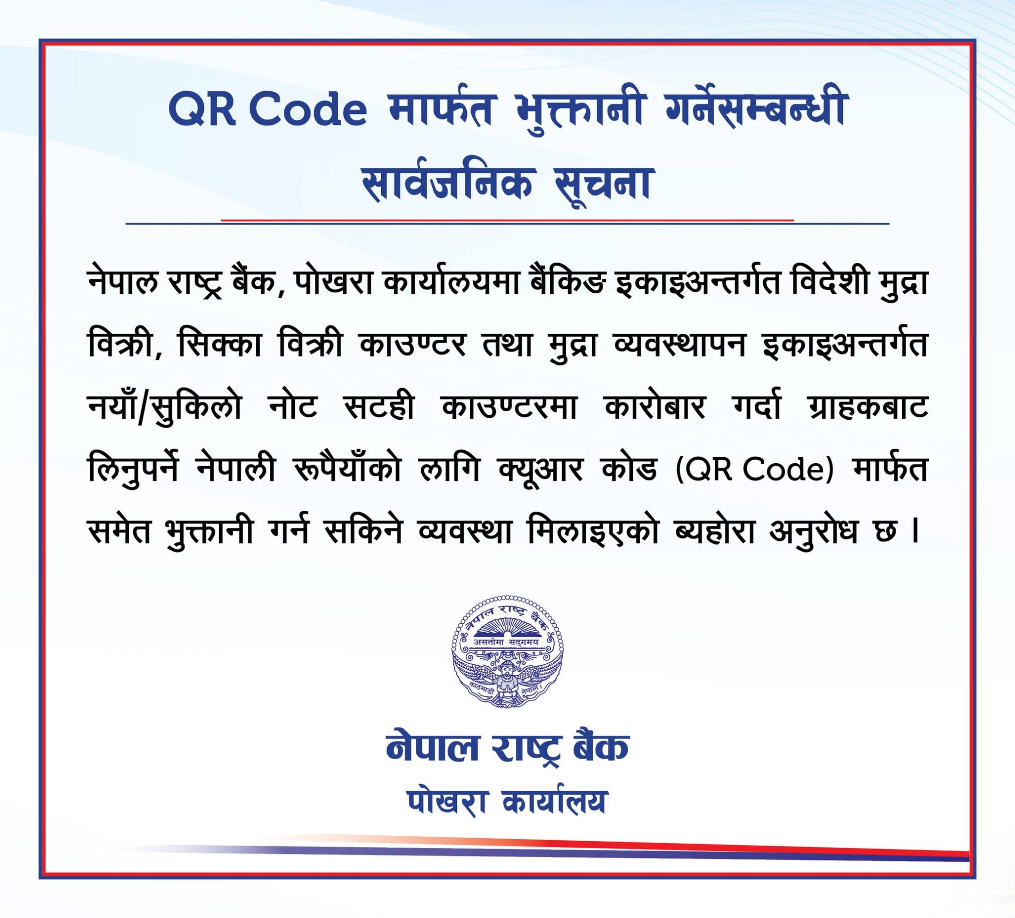 बैंकहरुले पोखरा कार्यालयमा क्यूआर कोड मार्फत नेपाली रुपैयाँ भुक्तानी गरेर विदेशी मुद्रा, सिक्का र नयाँ/सुकिलो नोट साट्न सक्ने नेपाल राष्ट्र बैंकले जानकारी दिएको हो।