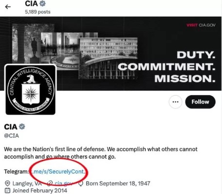 एक्समा अमेरिकी सेन्ट्रल इन्टेलिजेन्स एजेन्सी (सीआईए) अकाउन्ट सूचनाकर्ता लागि टेलिग्राम च्यानमा लिंक डिस्प्ले हुन्छ।