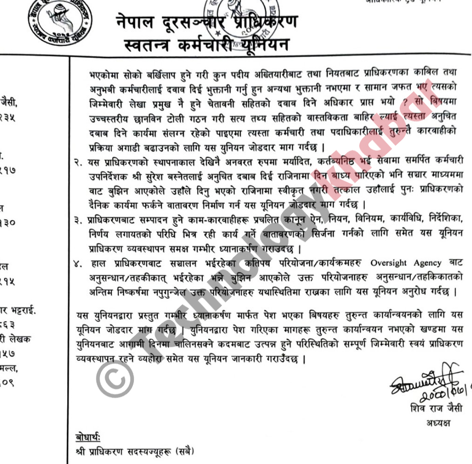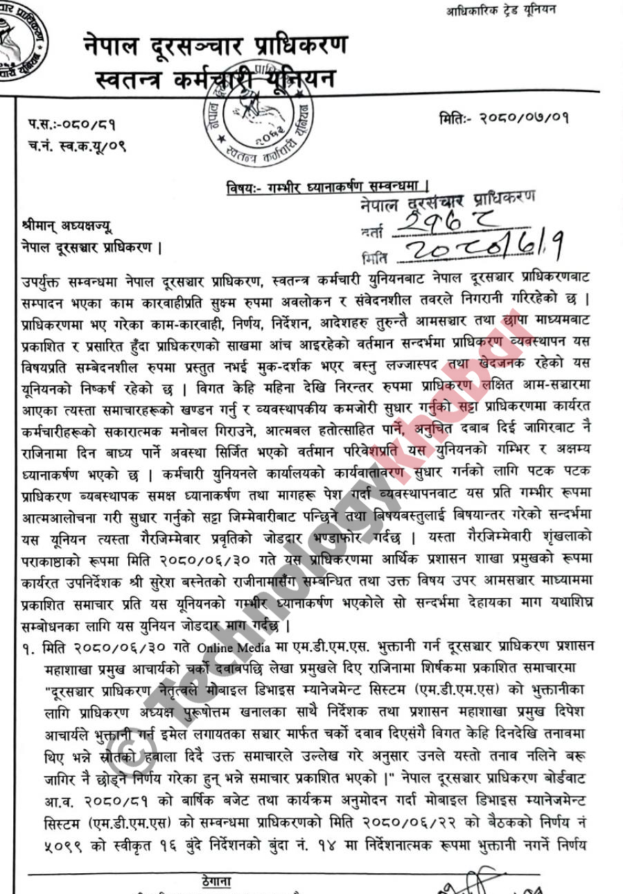 “नेपाल दूरसञ्चार प्राधिकरण बोर्डवाट आ.व. २०८०/८१ को बार्षिक बजेट तथा कार्यक्रम अनुमोदन गर्दा मोबाइल डिभाइस म्यानेजमेन्ट सिस्टम (एम.डी.एम.एस) को सम्वन्धमा प्राधिकरणको मिति २०८०/०६/२२ को बैठकको निर्णय नं ५०९९ को स्वीकृत १६ बुँदे निर्देशनको बुंदा नं. १४ मा निर्देशनात्मक रूपमा भुक्तानी नगर्ने निर्णय भएकोमा सोको बर्खिलाप हुने गरी कुन पदीय अख्तियारीबाट तथा नियतबाट प्राधिकरणका काबिल तथा अनुभवी कर्मचारीलाई दवाव दिई भुक्तानी गर्नु हुन अन्यथा भुक्तानी नभएमा र सामान जफत भए त्यसको जिम्मेवारी लेखा प्रमुख नै हुने चेतावनी सहितको दवाव दिने अधिकार प्राप्त भयो ? सो बिषयमा उच्चस्तरीय छानविन टोली गठन गरी सत्य तथ्य सहितको वास्तविकता बाहिर ल्याई त्यस्ता अनुचित दबाब दिने कार्यमा संलग्न रहेको पाइएमा त्यस्ता कर्मचारी तथा पदाधिकारीलाई तुरुन्तै कारवाहीको प्रक्रिया अगाडी बढाउनको लागि यस युनियन जोडदार माग गर्दछ,” ध्यानाकर्षण पत्रमा भनिएको छ।