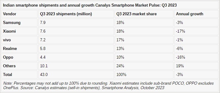 पछिल्लो क्यानलिस स्मार्टफोन मार्केट पल्स रिपोर्टअनुसार जुलाई-सेप्टेम्बर महिनाहरूमा कुल ४३ मिलियन स्मार्टफोनहरू भारतमा ढुवानी गरिएको छ। यो तथ्याङ्कले एक वर्ष अघिको मूल्यको तुलनामा ३ प्रतिशतको कमीलाई प्रतिनिधित्व गरेको उल्लेख छ।