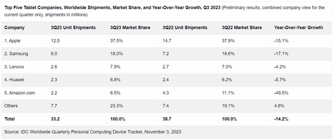 ट्याब्लेट बजार सन् २०२३ को तेस्रो त्रैमासमा गिरावट