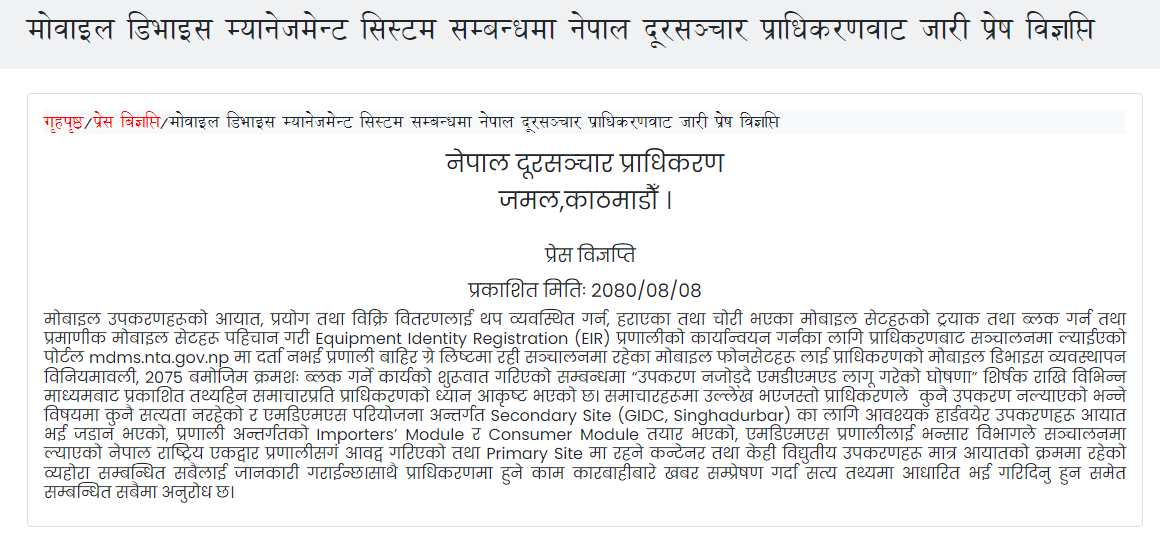 सो प्रणालीका लागि प्राधिकरणबाट एमडीएमएस डट एनटीए डट जीओभी डट एनपी mdms.nta.gov.np पोर्टल सञ्चालनमा ल्याईएको र सो पोर्टलमा दर्ता नभई प्रणाली बाहिर ग्रे लिष्टमा रही सञ्चालनमा रहेका मोबाइल फोनसेटहरू लाई प्राधिकरणको मोबाइल डिभाइस व्यवस्थापन विनियमावली, २०७५ बमोजिम क्रमशः ब्लक गर्ने कार्यको शुरूवात गरिएको दाबी गरेको छ।