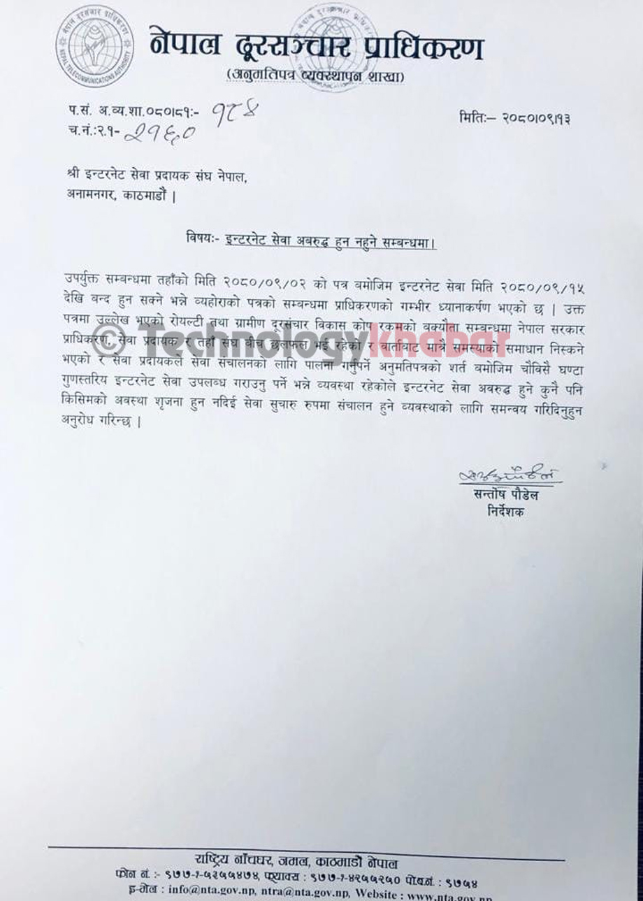 टेक्नोलोजीखबरले पाएको उक्त पत्रमा अनुमतिपत्र व्यवस्थापन शाखाको तर्फबाट प्राधिकरणका निर्देशक सन्तोष पौडेलले कुनैपनि अवस्थामा इन्टरनेट बन्द हुने कार्य नगर्न भनेका हुन्।