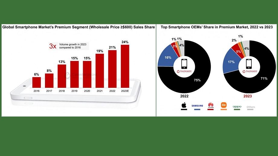 काउन्टरपोइन्ट रिसर्चले सन् २०२३ को प्रिमियम स्मार्टफोन बजारको बारेमा आफ्नो बिस्तृत तथ्यांक पोस्ट गरेको छ। सन् २०२३ को चौथो त्रैमासिकको प्रारम्भिक नतिजाहरूमा आधारित काउन्टरपोइन्ट रिसर्चको अनुसन्धान अनुसार ६०० अमेरिकी डलर भन्दा बढी मूल्य भएका स्मार्टफोनहरूको बिक्री वार्षिक आधारमा ६ प्रतिशतले बढेको छ।