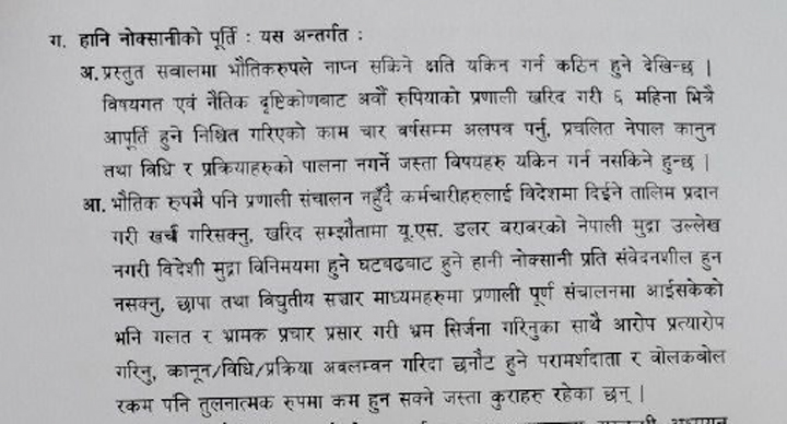 उक्त प्रतिवेदनमा भौतिकरुपले नाप्न सकिने क्षति यकिन गर्न कठिन हुने देखिएको भन्दै विषयगत एवं नैतिक दृष्टिकोणबाट अवौं रुपियाको प्रणाली खरिद गरी ६ महिना भित्रै आपूर्ति हुने निश्चित गरिएको काम चार वर्षसम्म अलपत्र पर्नु, प्रचलित नेपाल कानुन तथा विधि र प्रक्रियाहरुको पालना नगर्ने जस्ता विषयहरु यकिन गर्न नसकिने लेखिएको छ।