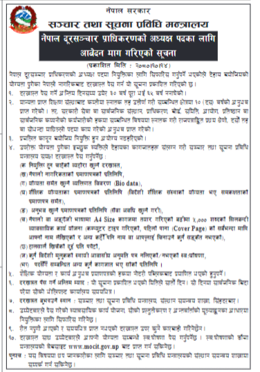 नेपाल दूरसंचार प्राधिकरणको अध्यक्ष पदमा नियुक्तिका लागि सिफारिस गर्नुपर्ने भएकोले योग्यता पुगेका नेपाली नागरिकबाट दरखास्त पेस गर्न सूचना प्रकाशित गरिएको उल्लेख छ।