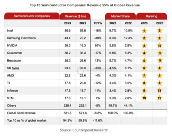 सामसङलाई पछि पार्दै अमेरिकी सेमीकन्डक्टर कम्पनी इन्टेल शीर्ष स्थानमा उक्लेको छ। इन्टेलको राजश्व पनि घटेको छ। इन्टेलको राजश्व १५ प्रतिशतले घटेको छ। २०२२ मा ५९.८ अर्ब अमेरिकी डलर राजश्व संकलन गरेको इन्टेलले २०२३ मा ५०.५ अर्ब अमेरिकी डलर राजश्व संकलन गरेको छ।