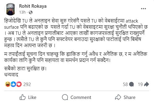 रोहितले आफ्नो फेसबुकमा लेखेका छन्, हिजोदेखि टियूले अनलाइन सेवा सुरु गरेसँगै यसले टियूको वेबसाइटमा अट्याक सर्फेस पनि बढाएको छ। यसले गर्दा टियूको वेबसाइटमा सुरक्षा चुनौती थपिएको छ। अब टियूले अनलाइन प्रणालीबाट आएका लाखौं कागजपत्रलाई सुरक्षित राख्नुपर्ने हुन्छ। त्यसैले टियूले कुनै कुनै पनि सफ्टवेयर बनाउँदा सुरक्षाको पाटोलाई पनि विशेष महत्व दिन अन्यन्त जरुरी छ।’