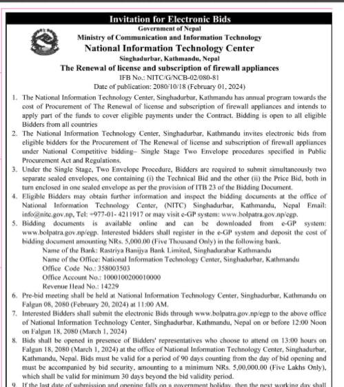 राष्ट्रिय सूचना प्रविधि केन्द्र (एनआईटीसी)ले लाइसेन्स नवीकरण र फायरवाल एप्लिकेशन सब्सक्रिप्सनको लागि बोलपत्र आह्वान गरेको छ।