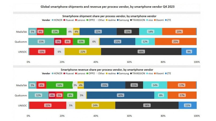 बजार विश्लेषक क्यानालिसले प्रोसेसर विक्रेताको आधारमा सन् २०२३ को चौथो त्रैमासिकको स्मार्टफोन बजारको बारेमा एक रिपोर्ट प्रकाशित गरेको छ।