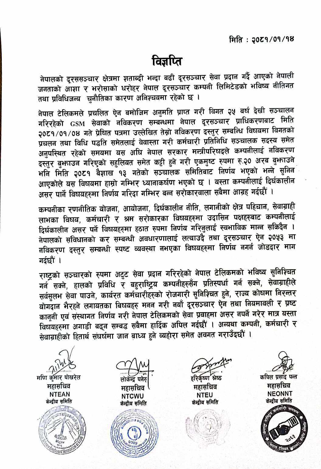 टेलिकममा कार्यरत कर्मचारीहरुको चारसंस्थाले संयुक्तरुपमा विज्ञप्ती जारी गर्दै नेपालको दूरससञ्चार क्षेत्रमा शताब्दी भन्दा बढी दूरसञ्चार सेवा प्रदान गर्दै आएको नेपाली जनताको आशा र भरोसाको धरोहर नेपाल दूरसञ्चार कम्पनी लिमिटेडको भविष्य नीतिगत तथा प्रविधिजन्य चुनौतिका कारण अनिश्चयमा रहेको बताएका छन्।