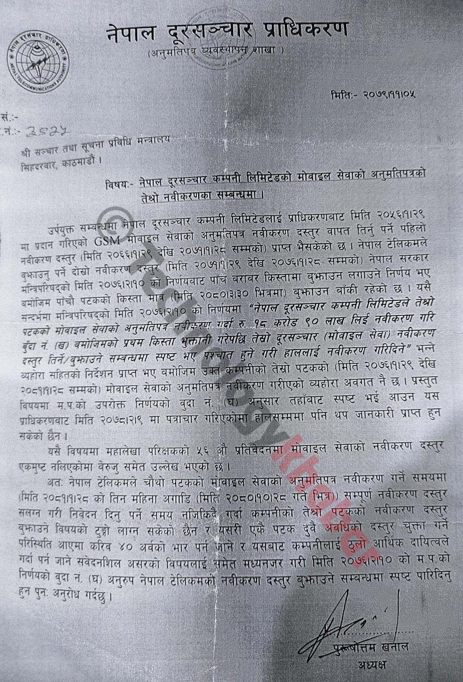 २०७९ फागुन ५ गते सञ्चार तथा सूचना प्रविधि मन्त्रालयमा पठाईएको उक्त पत्रमा नेपाल टेलिकमले चौथो पटक नवीकरण गर्ने समयमा सम्पूर्ण नवीकरण दस्तुर संलग्न गरी निवेदन दिनुपर्ने उल्लेख छ।