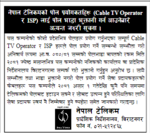 टेलिकमको प्रादेशिक निर्देशनालयले जेठ महिनाको अन्तिमसम्म पोलभाडा बापतको रकम नबुझाएमा सबै तार हटाउने सार्वजनिक सूचना जारी गरेको छ।