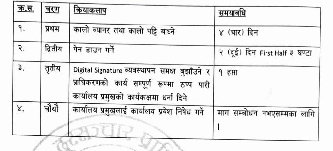 यसैगरी तेस्रो चरणमा डिजिटल सिग्नेचर व्यवस्थापनलाई बुझाएर प्राधिकरणको कामकारबाही ठप्प पार्दै एक सातासम्म अध्यक्षको कार्यकक्ष घेराउ गर्ने योजना राखेको छ।