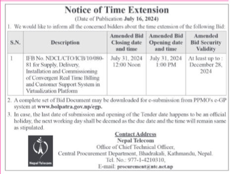 कम्पनीले आज चौथोपटक बिलिङ्ग सिस्टमको टेन्डरको म्याद थप गरेको सूचना प्रकाशित गरेको छ। जसअनुसार अब जुलाई ३१ तारिख अर्थात साउन १६ गतेसम्मको समय थपिएको हो।