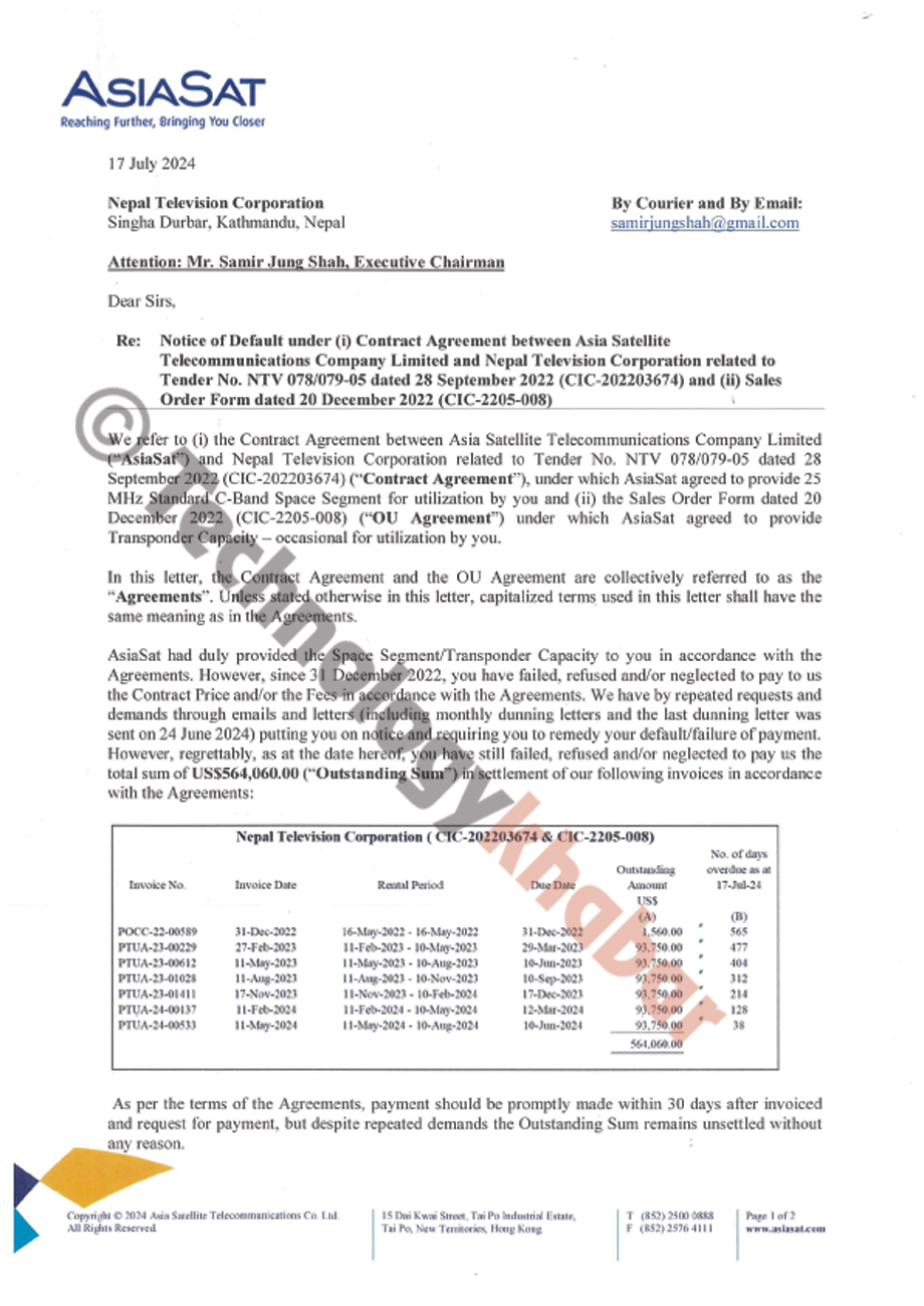 पत्रअनुसार, एशियास्याटले सम्झौता अनुसार तपाईलाई स्पेस सेगमेन्ट/ट्रान्सपन्डर क्षमता प्रदान गरेको थियो। यद्यपि, ३१ डिसेम्बर २०२२ देखि, तपाईंले हामीलाई सम्झौता मूल्य र/वा शुल्कहरू सम्झौता अनुसार तिर्न असफल, अस्वीकार र/वा बेवास्ता गरेको दाबी छ।