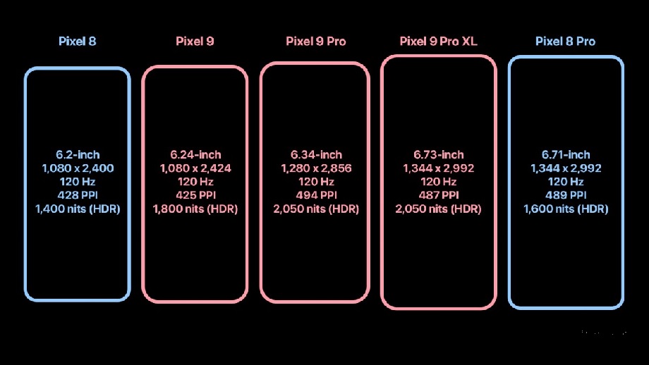 पिक्सेल ९ प्रो एक्सएलमा भने ६.७३–इन्च प्यानलको साथ यी मोडेलहरूमध्ये सबैभन्दा ठूलो डिस्प्ले समावेश गरिने जनाइएको छ र १,३४४ × २,९९२पीएक्स (पिक्सेल) रेजोलुसनयुक्त यसले १२० हर्ज रिफ्रेस रेट प्रदान गर्ने जीएसएमएरिनाले उल्लेख गरेको छ।![]()