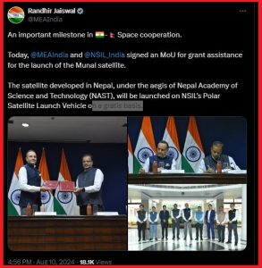 यसबारे भारतीय विदेश मन्त्रालयका आधिकारिक प्रवक्ता रणधीर जैसवालले एक्स (पहिलेको ट्विटर ) मा लेखेका छन्, ‘ नेपालको नेपाल विज्ञान तथा प्रविधि प्रज्ञा प्रतिष्ठान नास्ट को सहयोगमा तयार पारिएको मुनाल स्याटलाइट अनुदानका रुपमा एनएसआईएलको पोलर स्याटलाइट लञ्च भेइकलमार्फत् प्रक्षेपण गरिनेछ।’
