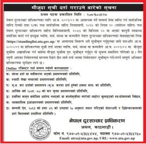 सूचनामा यस प्रकारको कार्य गर्न इच्छुक व्यक्ति, फर्म, संस्था वा कम्पनीले नेपाल दूरसञ्चार प्राधिकरणको वेबसाइटको लिंक (https://standinglist.nta.gov.np/ मा आवश्यक विवरण भरी सूचीकृत गर्न आग्रह गरेको हो।
