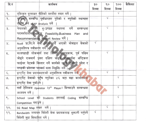 यस्तै १०० दिनमा गरिनेका कार्यहरुमा भने एकीकृत दूरसञ्चार नीतिको मस्यौदा तयार गर्ने नयाँ सेवा प्रदायक भित्र्याउने बारेमा अध्ययन गराउने इन्टरनेट नपुगेका वडा कार्यालयहरुमा इन्टरनेट पुर्याउने लगायतका विषय समावेश छन्।