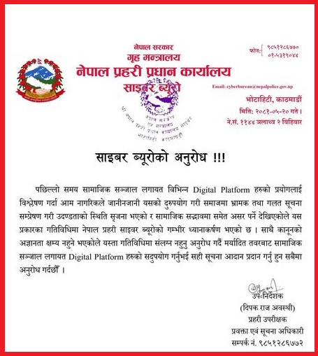 नेपाल प्रहरीको साइबर ब्युरोले पछिल्लो समय सामाजिक सञ्जाल लगायत विभिन्न डिजिटल प्लेटफर्मको दुरुपयोग भएको निष्कर्ष निकालेको छ।
