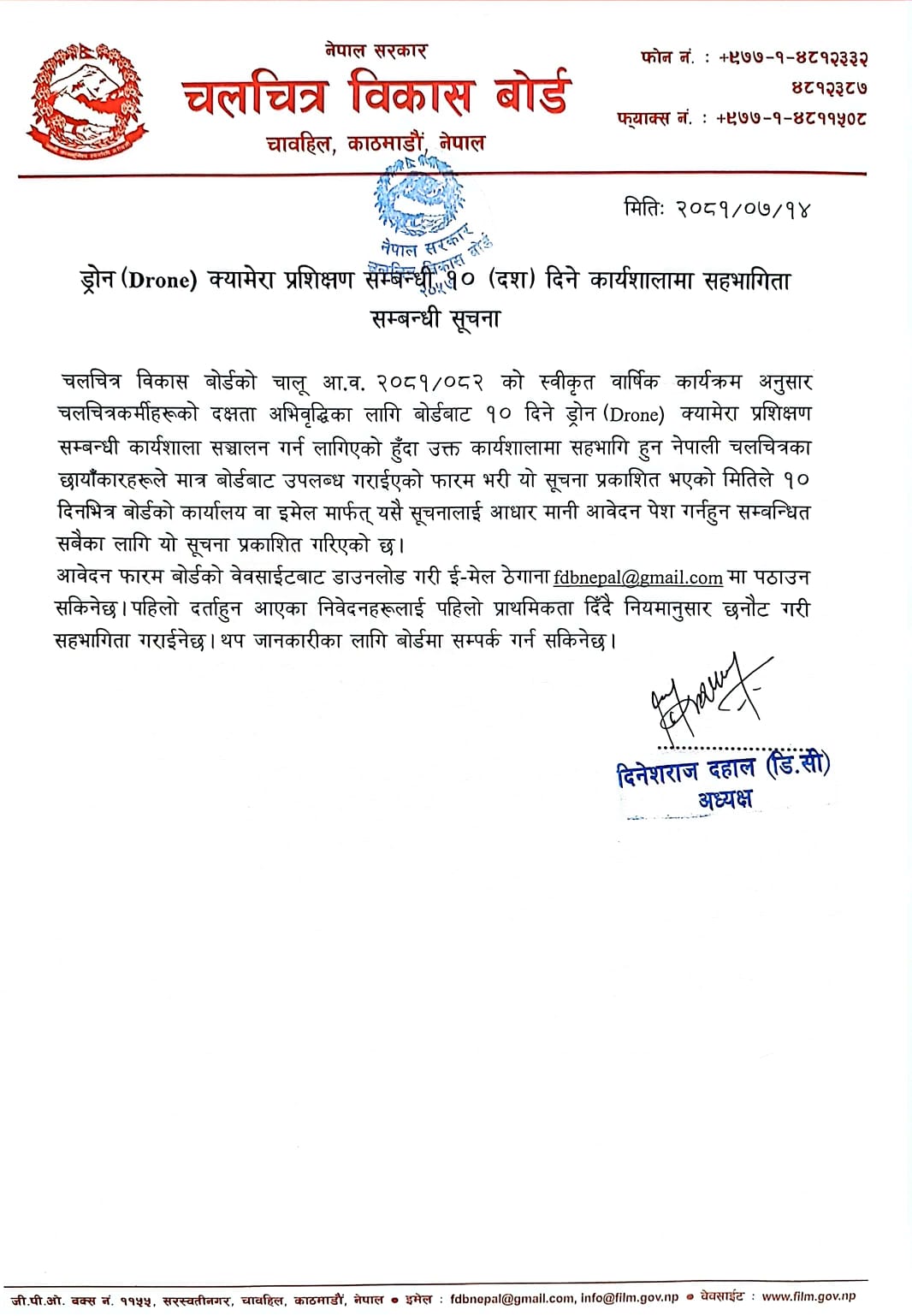 उक्त सूचनामा चलचित्रकर्मीको दक्षता अभिवृद्धिका लागि २५ जना नेपाली चलचित्र छायाँकार (क्यामेराम्यान) लाई प्रशिक्षणमा सहभागी गराउने जनाइएको छ। उक्त् १० दिने ड्रोन क्यामेरा सञ्चालनको प्रशिक्षण सम्बन्धी कार्यशालामा नेपाली चलचित्रका छायाँकारले आवेदन दिन पाउने व्यवस्था गरिएको छ ।