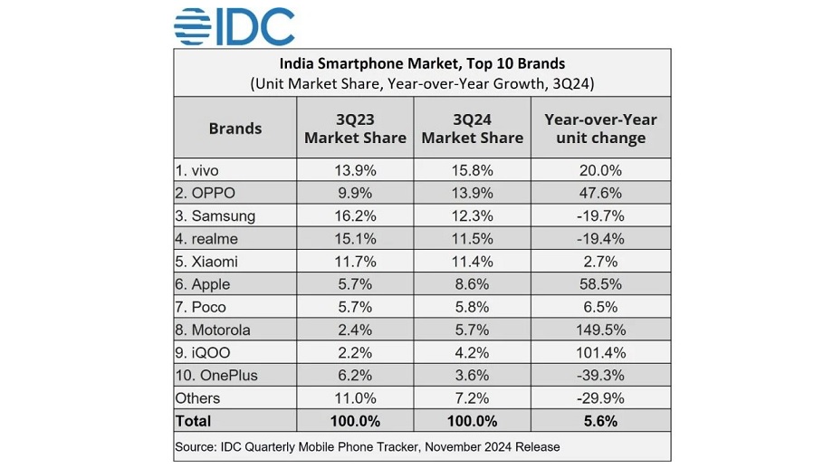 मोटोरोला पछि, आईकू ले सन् २०२४ को तेस्रो त्रैमासिकमा (२०२३ को तेस्रो त्रैमासिकको तुलनामा) ४.२ प्रतिशतको बजार हिस्साको साथ १०१.४ प्रतिशतको सबैभन्दा ठूलो छलाङ लगाएको उल्लेख छ।