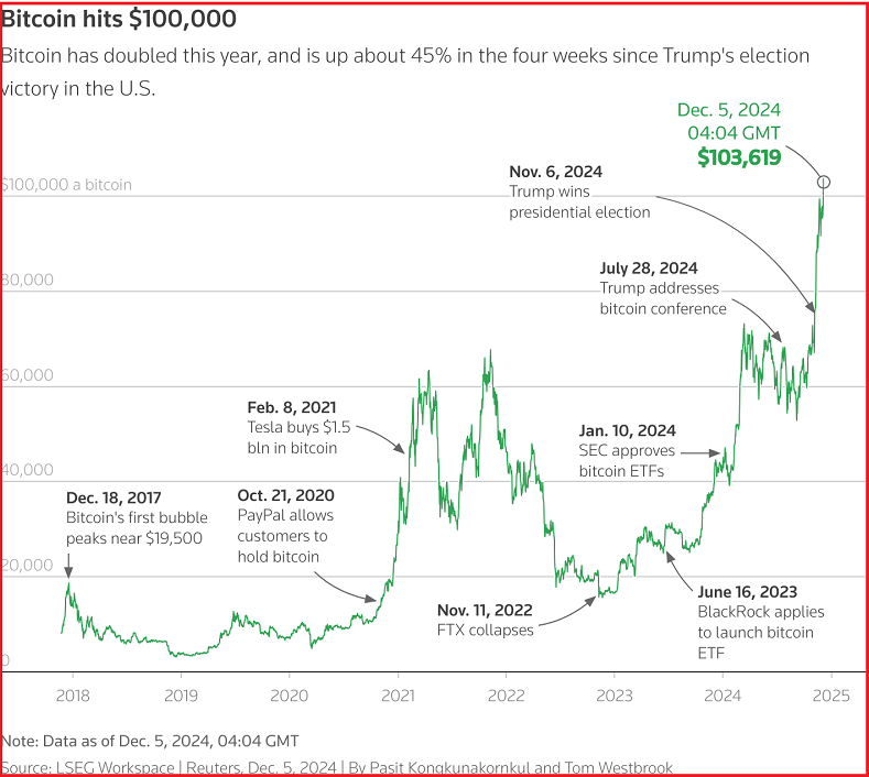 बिटक्वाइनको मूल्य सन् २०२४ मा दोब्बरभन्दा बढीले वृद्धि भयो। यसको मुख्य कारण अमेरिकी बजार नियामकले बिटक्वाइनको वास्तविक मूल्यलाई ट्र्याक गर्ने एक्सचेन्ज-ट्रेडेड फन्डहरू (ईटीएफ) लाई स्वीकृति दिनु र डोनाल्ड ट्रम्प फेरि ह्वाइट हाउसमा फर्कने सम्भावनासँगै नियामक अवरोधहरू कम हुने आशा रहेको आकलन छ।
